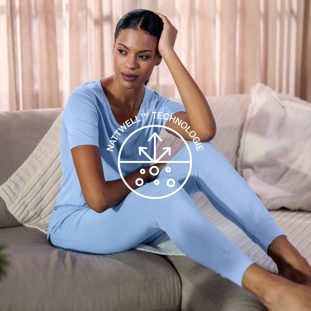 Das NATTWELL™-Gewebe wird aus Buchenholzfasern hergestellt und vereint sowohl hydrophile als auch hydrophobe Eigenschaften. Unsere Balance-Schlafbekleidung leitet Schweiss viermal effektiver von der Haut ab als Baumwolle und sorgt dank Verdunstungskälte und effizientem Feuchtigkeitstransport für ein angenehm kühles und trockenes Tragegefühl. Nächtliches Schwitzen gehört somit der Vergangenheit an – somit bleibst du kühl und trocken und hältst deine optimale Schlaftemperatur.