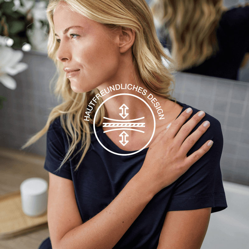Empfindliche Haut verdient besondere Pflege. Deshalb haben wir jedes Detail durchdacht – von ergonomisch platzierten, flachen Nähten bis zu etikettfreien Designs, um Hautreizungen zu vermeiden. Der dermatologisch getestete Stoff ist besonders sanft zur Haut und ideal für Menschen mit Hauterkrankungen wie Ekzemen. Unsere Schlafbekleidung fühlt sich unglaublich weich an, wirkt beruhigend und hilft deiner Haut, sich genauso gut zu erholen wie du.